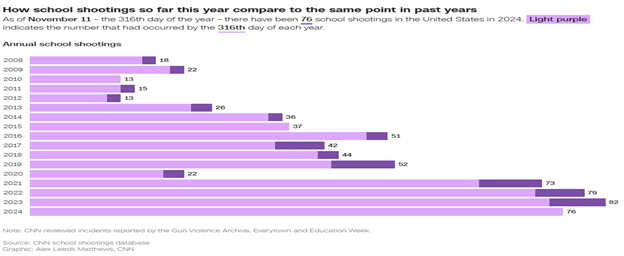 [5] Matthews, Alex Leeds, Amy O’Kruk, and Annette Choi. 2024. “School Shootings in the US: Fast Facts.” CNN. November 12, 2024.